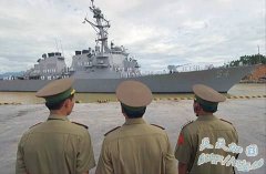 2004年7月28日,越南军官观看柯蒂斯-威尔伯号导弹驱逐舰(DDG-54)准备停靠在越南岘港码头。这是自1973年以来美国军舰再度停靠岘港。此次访问象征美国和越南关...