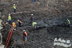据纽约时报报道,2010年 7月14日,纽约,在美国世贸中心遗址,考古学家正在挖掘一艘大概在18世纪晚期或者19世纪早期时候的船只。该船是在近日的一次建筑挖掘时...