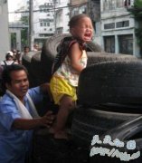 一名男童被红衫军示威者举在轮胎路障前,他的头部清楚地暴露在泰国士兵的枪口下 男童一手拿着奶瓶,另一手则试图在用轮胎堆成的堡垒上维持平衡 据英国《每日邮报...