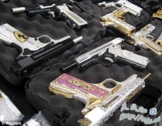 31支手枪上都镶有金银箔片和钻石 镶满金银宝石的枪支 枪支上闪耀的镶钻 手枪的扳机上也镶嵌了钻石 据《每日邮报》报道,墨西哥警方近日在突袭一个黑帮头目的住...