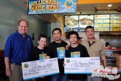 美国加州彩票局官员5月5日向夏威夷烧烤店的三位华人店主杨迈克、何丹尼、欧家豪(左2、3、4)颁发彩票巨奖销售奖金100万美元 华人餐馆再度成为美国彩民的幸运地。...