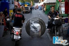 4月29日,当地男子骑摩托车出入位于泰国首都曼谷市中心的红衫军宿营地点。泰国总理阿披实4月30日说,政府将采取更加严厉的措施,阻止红衫军随意出入集会地点曼...