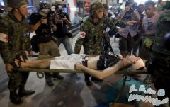 4月22日,在泰国首都曼谷是隆路,泰国军人正在用担架转移一名在爆炸中受伤的男子。据报道,泰国首都曼谷市中心商业区22日发生两起爆炸,伤亡人数不详。新华社/...