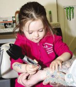 年仅3岁的露比想做世界最小文身师。 扬子晚报4月18日报道 据英国媒体17日报道,大多数小女孩都喜欢用水彩笔在纸上信手涂鸦,可是现年3岁半的英国小姑娘露比狄更...