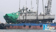 4月15日,工作人员在韩国白翎岛用大型起重机将在西部海域爆炸沉没的天安号警戒舰的舰尾部分打捞起来并放到一艘驳船上。当地时间15日下午1时14分(北京时间12时1...