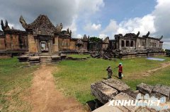 资料图片 2008年10月19日,在柬埔寨北部与泰国交界处的柏威夏寺,两名柬埔寨男子从柏威夏寺遗迹内穿过。 新华网曼谷4月17日电(记者史先振 张秋来)泰国电视...