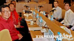 3月29日,泰国总理阿披实(右一)在曼谷会见红衫军代表。泰国总理阿披实与红衫军代表当晚举行的第二轮谈判仍未能就解散国会下议院的时间达成协议。新华社/法新...