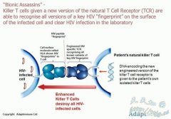 科学家利用DNA技术,对杀伤性t细胞 ( killer t cell)进行结构改造,然后再把增强后的杀伤性t细胞植入艾滋病患者身体内部。杀伤性t细胞随后会摧毁已被感染HIV病...