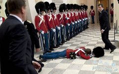 图为士兵晕倒后,工作人员马上赶来。 1月27日,丹麦女王在首都哥本哈根设宴款待议会议员,一名皇家卫兵突然晕倒在地,不知是否站得太久饿晕了。 图为工作人员将...