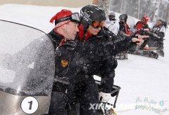 1月3日,俄罗斯总统梅德韦杰夫(左)和总理普京在俄南部索契市郊外的红波利亚纳滑雪场乘坐雪地车。新年假日期间,两人延续去年的传统,再次来到这里一起滑雪,...