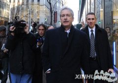 1月16日,在美国纽约欧盟常驻联合国代表团驻地外,美国负责政治事务的副国务卿威廉伯恩斯 (右二)在会谈结束后离开。来自美国、俄罗斯、中国、英国、法国和德...