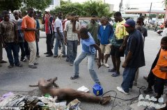 1、一名被怀疑是劫匪的男子被扒光衣服,双脚双腿被绑着,活活打死。一名男子在前边拉着他,另外一名男子手持鞭子使劲抽打。许多人围观看着血淋淋的尸体,包括很...