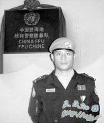 海地时间2008年7月11日上午,被联合国授予和平勋章的黄礼杰,穿着维和警察防暴队队服,佩戴着联合国和平勋章,在驻扎营地内留影。照片由铜陵边防检查站提供 海...