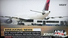 资料图片:这张摄于12月27日的电视画面显示,发生混乱事件的美国达美航空公司航班停在底特律都会机...