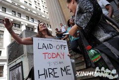 9月14日,在美国纽约华尔街的联邦大厅外,一名失业者手拿标语进行抗议。当日,美国总统奥巴马在华尔街的联邦大厅就金融危机一周年发表演讲。新华社记者谷欣容摄...