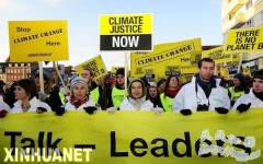 12月12日,在丹麦首都哥本哈根,游行者向联合国气候变化大会会场贝拉会展中心进发。当天,人们走上哥本哈根街头,呼吁各国采取行动保护地球,争取联合国气候变...