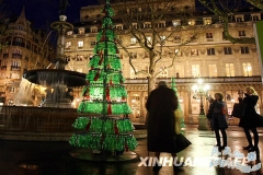 12月3日,在法国巴黎安德烈马尔罗广场,路人为塑料瓶做成的圣诞树拍照。这些圣诞树是一个环保项目的一部分。新华社/法新 澳大利亚研究人员12日说,用真树装饰...