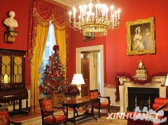 12月2日,美国首都华盛顿白宫的红屋摆放了一棵系满红色绸带的圣诞树。当日,美国白宫2009年圣诞节装饰全部完成。来自美国24个州的92名志愿者耗时3400个小时参与...
