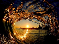 图为卷起的海水构成拱形,拱的中间自然而然形成一个空洞,阳光照射下,像一个万花筒一样,色彩万千,变幻莫测。 这张照片中,克拉克面对着巨浪,临危不惧,手持...