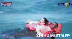 这张11月22日拍摄的电视截图照片显示,在靠近新加坡的卡里摩岛附近,两名遇险乘客在海上等待救援。一艘载有约250人的渡轮当天在印尼苏门答腊岛附近沉没,目...