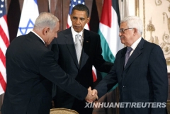 资料图片: 9月22日,在美国纽约,美国总统奥巴马(中)与以色列总理内塔尼亚胡(左)和巴勒斯坦民族权力机构主席阿巴斯举行三方会谈。新华社/路透 重启和谈目...