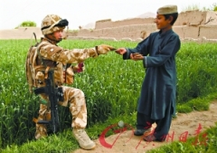 3月27日,在阿富汗南部,一名英军士兵把一块饼干递给了当地一个小男孩。(资料图片) 对付反叛乱的真正武器,不是真刀真枪,而是能在短期内通过金钱来改变安全...
