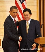 资料图片:11月13日,美国总统奥巴马(左)与日本首相鸠山由纪夫在日本东京首相官邸出席记者招待会。新华社/法新 日本首相鸠山由纪夫13日晚与到访美国总统贝...