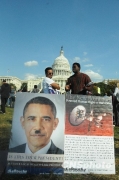 十月十三日,来自马萨诸塞州、新罕布什尔州等的二十多个倡导移民改革团体组织数千人在国会山举行综合移民改革大型集会。图为一名机会者携带丑化奥巴马的图像,...