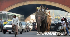 10月29日,在印度首都新德里,大象与汽车、摩托车、自行车一同在马路上行进。 在印度街头有一种奇特的景观,人们经常能看见大象招摇过市,参加婚礼等庆典活动。...