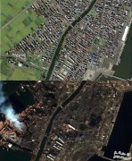 仙台地区海啸地震前后对比图 距离日本9级大地震发生已过去72小时,黄金救援时间已过,但部分重灾区情况依然恶劣,面临多重挑战,而核辐射问题带来的挑战最为严...