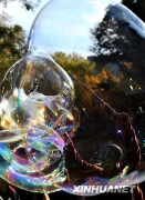 10月11日,在美国纽约中央公园,一名艺人用自制的工具造出多彩的泡泡供游人观赏,让秋日的中央公园充满了童真的情趣。新华社记者申宏摄 10月11日,两个孩子在美...
