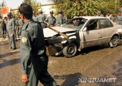 10月10日,阿富汗警察在东北部的昆都士省查看被炸坏的一辆汽车。当天,阿富汗快速反应部队在该地区总部的一辆汽车遭到炸弹袭击,一名军官被炸死。新华社发 新华...