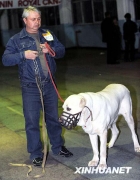10月10日,在吉尔吉斯斯坦首都比什凯克,一名男子在比赛中展示爱犬。吉尔吉斯斯坦全国犬种比赛10日在首都比什凯克举行。来自吉各地的280余只名犬参加了此次大赛...