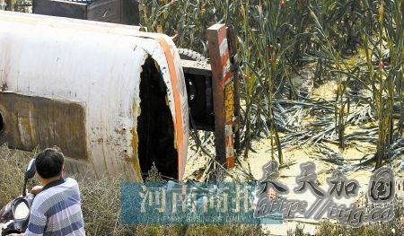 河南商报8月10日报道 昨日13时20分许,郑州市惠济区小双桥村村民王海涛正在装修自家新房,突然听到“轰隆”一声巨响,他跑出去一看,一辆车牌号为豫A79373的罐车侧翻在他家对面的庄稼地里。
