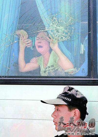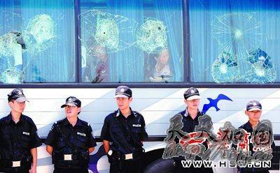 昨日上午11时许,华东村村口的西安环山公路已被警方戒严,东边100米外停着一辆旅游大巴,车号是陕AD0676,车玻璃已被砸碎,特警严密围在车四周,而特警外又围着一群人,情绪比较激动,不断向车里谩骂,呼喊声、哭叫声乱作一团。