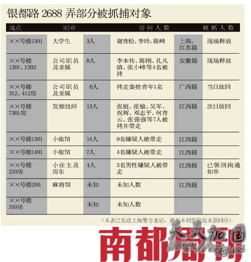 据上海公安网当晚发布的消息,此番行动最后总抓获65人。而南都周刊记者调查发现,包括上述三家在内,仅银都路2688弄一处抓捕点,当天至少有6处房间被错破门而入,30人被惊扰,其中12人被错拷,8人被带走后放回。