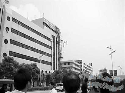 据目击者洪先生称,昨日下午5时多,风云突变,天空中雷声滚滚并且刮起了大风,大约6时20分,只听“轰”的一声巨响,电信局楼顶高耸的铁塔连根折断,垂吊至该楼二楼空中(如图),紧邻铁塔的楼内玻璃被击碎散落一地。