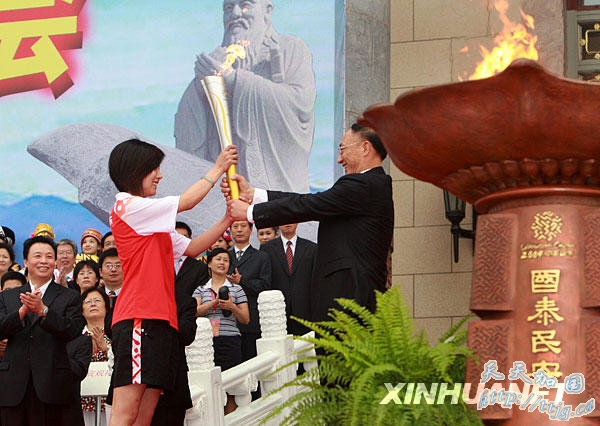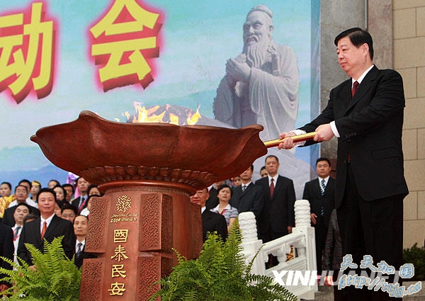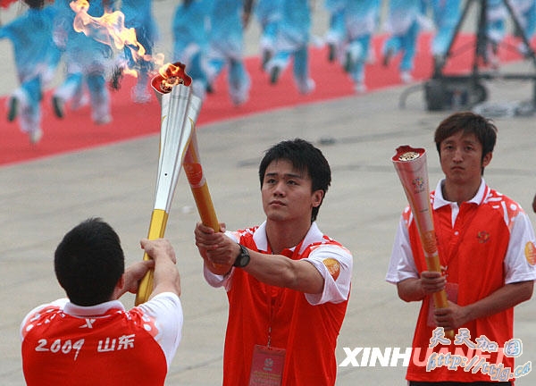 8月16日,山东省委书记姜异康用点火棒点燃“国泰民安”圣火坛。