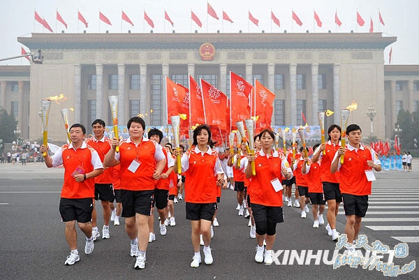 8月16日,杜丽(中)等火炬手高举火炬从人民大会堂东门外广场起跑。
