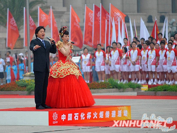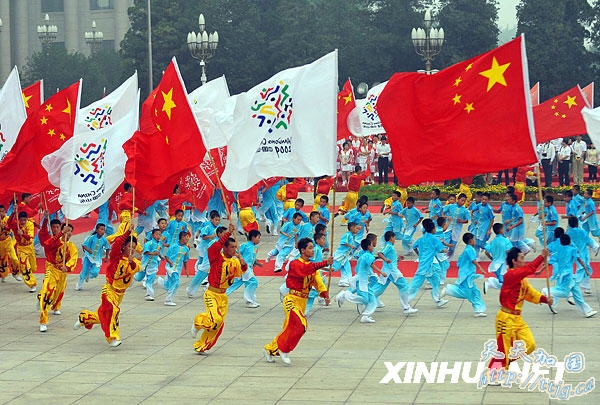 当日,以“祝福祖国,共享全运”为主题的第十一届全国运动会火炬传递活动点火起跑仪式在北京人民大会堂东门外广场举行。各省、自治区、直辖市及香港、澳门特别行政区都派代表参加了仪式。新华社记者罗晓光摄