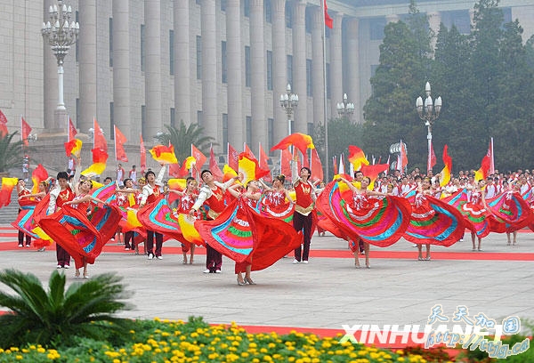 8月16日,演员们在人民大会堂东门外广场进行表演。新华社记者罗晓光摄