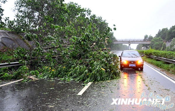 海南省西线高速公路两旁的许多树木被强风刮断(8月7日摄)。