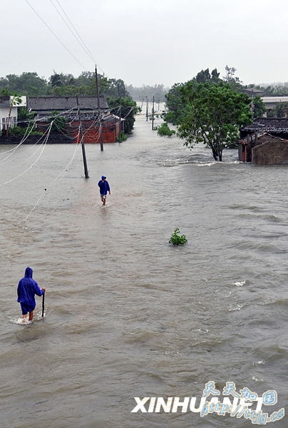 8月7日,两位村民行走在海南省儋州市东成镇被水淹没的道路上。新华社记者 郭程 摄