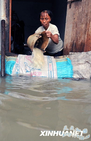 8月7日,海南省儋州市春深村的一位妇女正在清排屋中的积水。