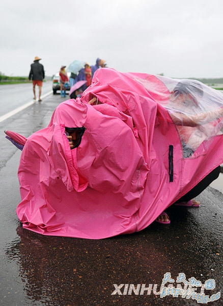 8月7日,海南省儋州市东成镇羊坊村的村民们正在村旁的高速公路上等待撤离。新华社记者 郭程 摄