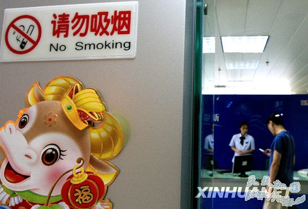 上海市武宁路上一家电器商场内的禁烟标识十分醒目(8月18日摄)。上海市第十三届人大常委会第十三次会议8月 17日审议了《上海市公共场所控制吸烟条例(草案)》,将在国家机关提供公共服务的办事场所等10大场所禁止吸烟,并对机场、旅馆、娱乐场所、餐饮场所等提出控烟要求。新华社记者 陈飞 摄