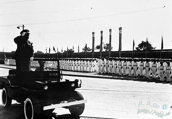 1952年10月1日,朱德总司令乘车检阅中国人民解放军陆海空三军仪仗队。