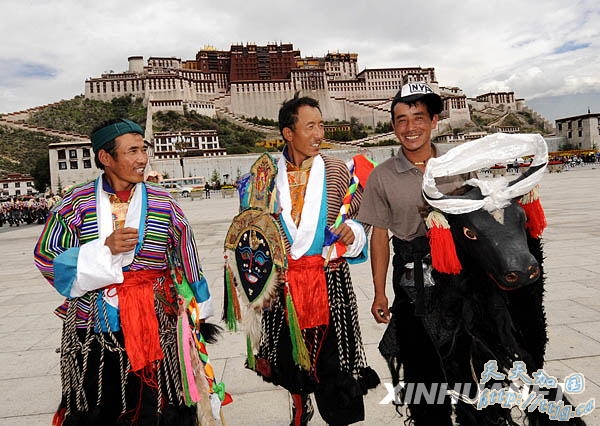 8月20日,人们在拉萨布达拉宫广场上表演传统藏戏及歌舞。