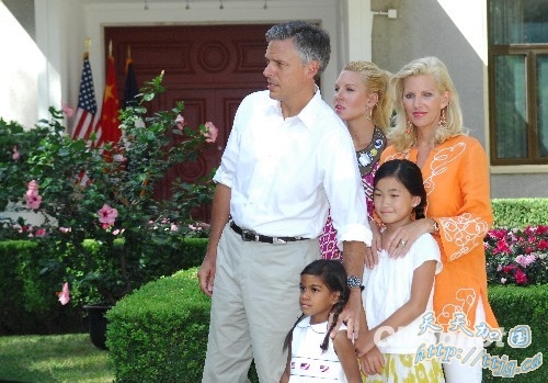 8月22日,美国新任驻华大使Jon Huntsman(中文名:洪博培)在北京美国大使馆新闻处举行到任媒体会。洪博培发表了履新感言并介绍了自己的家人。图中前排为洪博培在印度收养的女儿阿莎、中排左一为洪博培、左二为在中国扬州收养的女儿杨乐意、后排左一为大女儿玛丽安、左二为妻子玛丽。中新社发 侯宇 摄