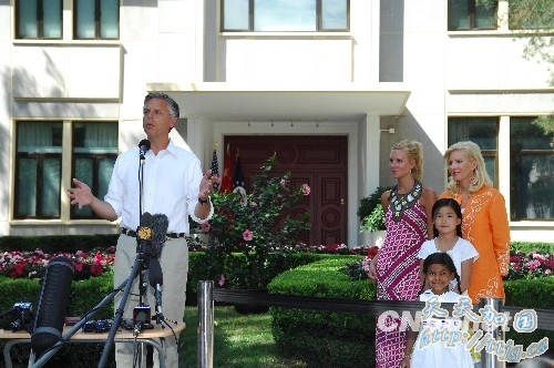 8月22日下午,美国新任驻华大使Jon Huntsman(中文名:洪博培,左一)在北京美国驻中国大使馆新闻处举行媒体见面会。洪博培发表了履新感言并介绍了他的家人。